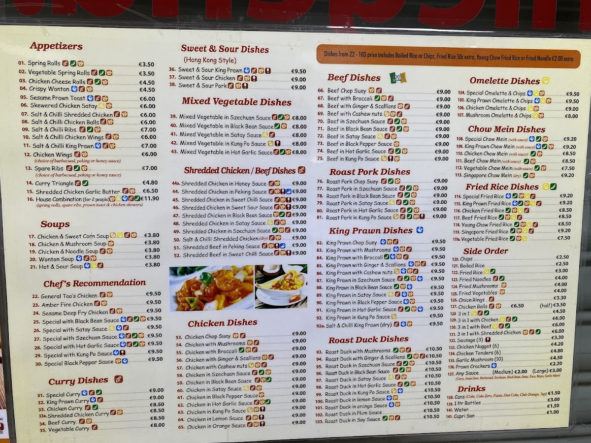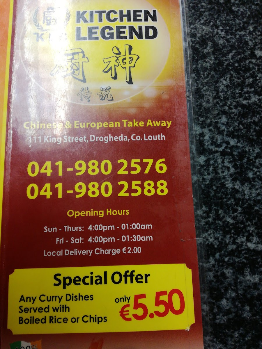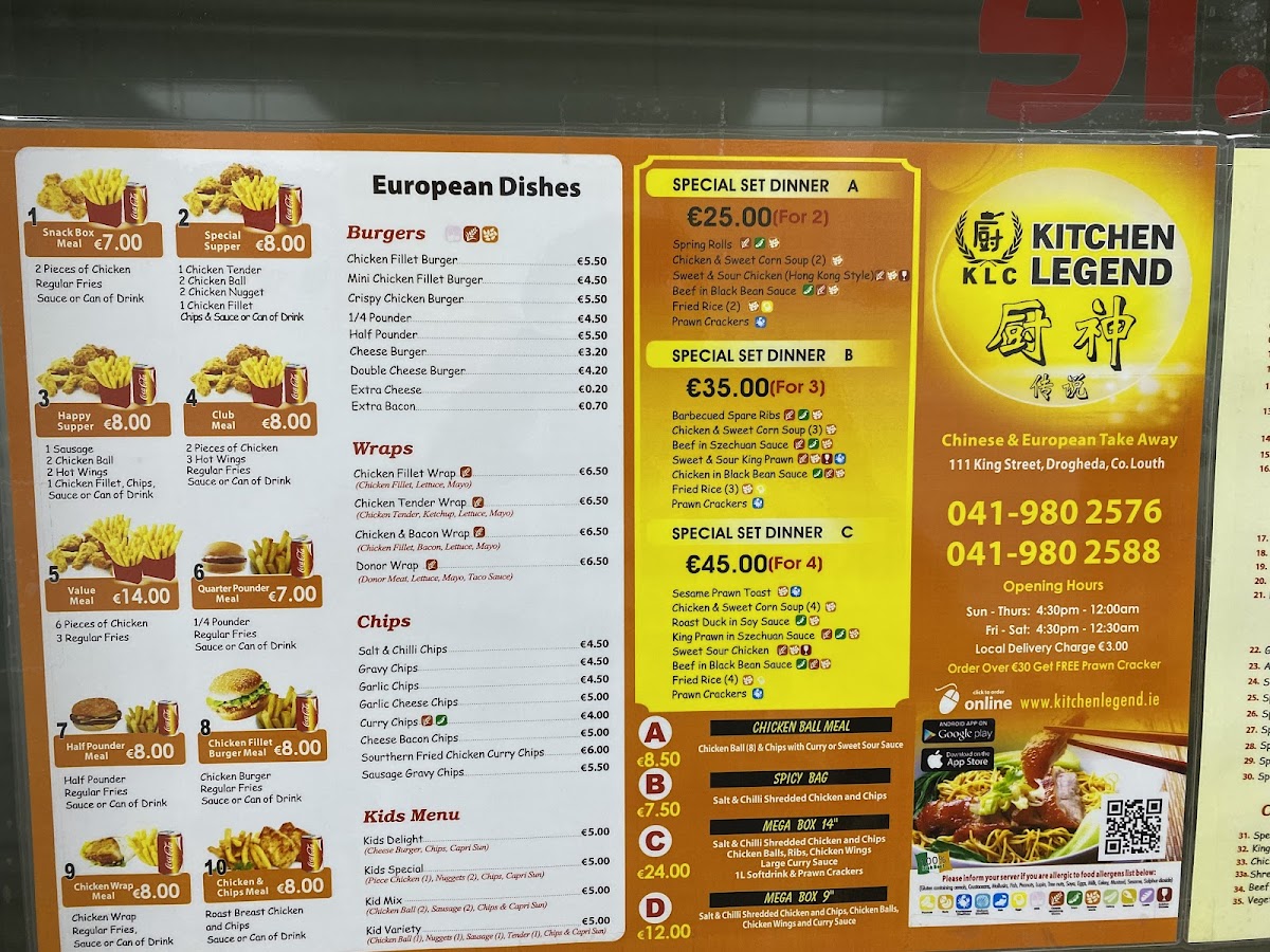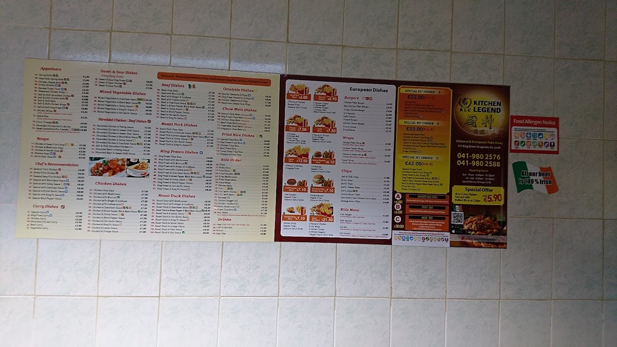 From a reviewer’s perspective, the menu at Kitchen Legend on 111 King St, East Drogheda, is a comprehensive and diverse selection that caters to a wide range of tastes. The restaurant offers generous Set Dinners like Set Dinner A For 2 People, Set Dinner B For 3 People, and Set Dinner C For 4 People, as well as convenient Meal Deals such as the Chicken Ball Meal, Spicy Bag, and the Mega Box 14" or Mega Box 9", perfect for sharing. Starters include Spring Rolls, Vegetable Spring Rolls, Chicken Cheese Rolls, Chicken Rice Roll (New), and Crispy Won Ton, setting the stage for the more substantial dishes. Signature items under Chef’s Recommendation-like General Tao's Chicken, Amber Fire Chicken, and Sesame Deep Fry Chicken-highlight the kitchen’s flair for bold flavors. Soups range from the comforting Chicken & Sweetcorn Soup to the fiery (H) Hot & Sour Soup, while curry lovers can enjoy options such as Special Curry, King Prawn Curry, and Shredded Chicken Curry. The menu also impresses with its Sweet & Sour Dishes, including Sweet & Sour King Prawn and Sweet & Sour Chicken, alongside a variety of Mixed Vegetable Dishes in sauces like Szechuan, Satay, and Kung Po. For meat lovers, the Shredded Chicken, Beef, Chicken, Roast Pork, King Prawn, and Roast Duck Dishes offer both classic and inventive preparations, from Shredded Chicken In Honey Sauce to Roast Duck In Satay Sauce. Egg and noodle options, including Special Omelette & Chips, Special Chow Mein With Sauce, and Special Fried Rice, provide hearty comfort, complemented by a selection of Side Orders and Sauces to customize each meal. For lighter fare, the menu features Burgers, Wraps, and an array of Chips, while younger diners can enjoy Kids Delight Meal or Kids Variety Meal. Overall, the menu at Kitchen Legend balances traditional favorites with creative twists, offering generous portions and something to suit nearly every palate.